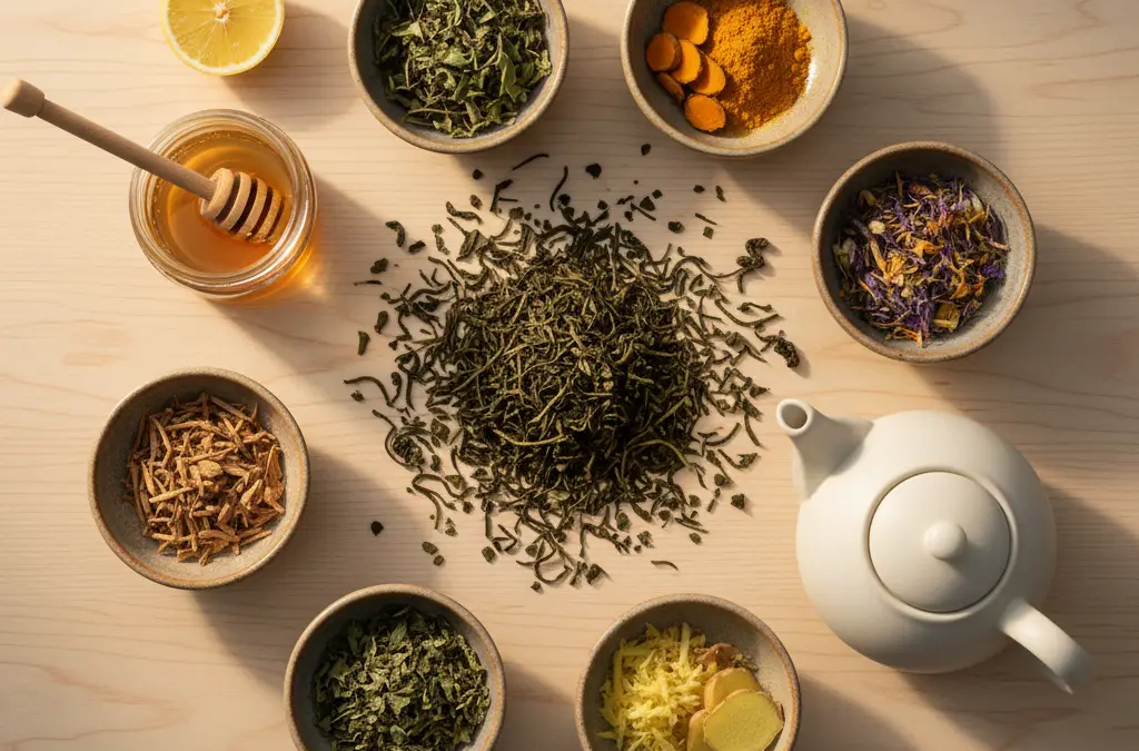 Mélangez tulsi + gingembre pour dégager les voies respiratoires, curcuma + poivre noir pour une meilleure biodisponibilité, citron + thé vert pour optimiser l’absorption des catéchines. Ajoutez miel ou jaggery pour la chaleur et un apport doux. Testez les proportions : commencez léger et ajustez selon le goût.